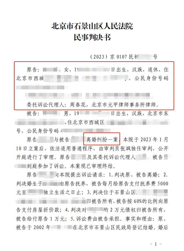 元甲律師提供雙方分居一年以上的證據(jù)材料,最終法院判決解除徐女士與王某的婚姻關(guān)系,判決王某每月支付5000元撫養(yǎng)費(fèi),北京房產(chǎn)歸屬于徐女士所有;在元甲律師的專業(yè)幫助下徐女士的訴求均得到實(shí)現(xiàn)!